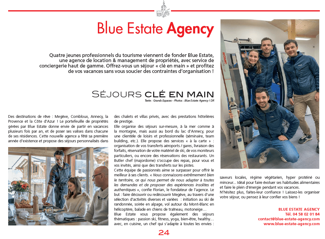 Last December, we were delighted to see an article presenting our agency and its activities appear on page 24 of the well-known local newspaper “LA TRIBUNE DE MEGEVE”.