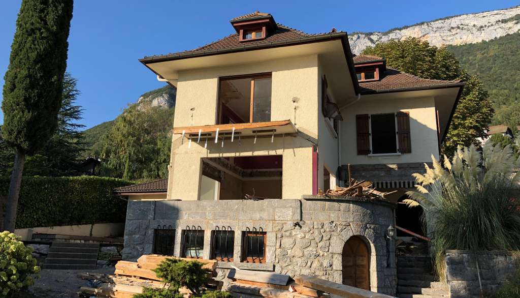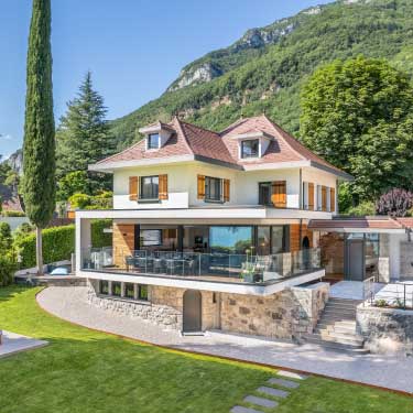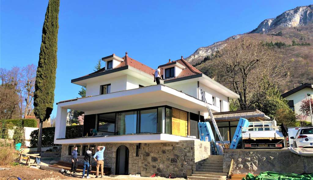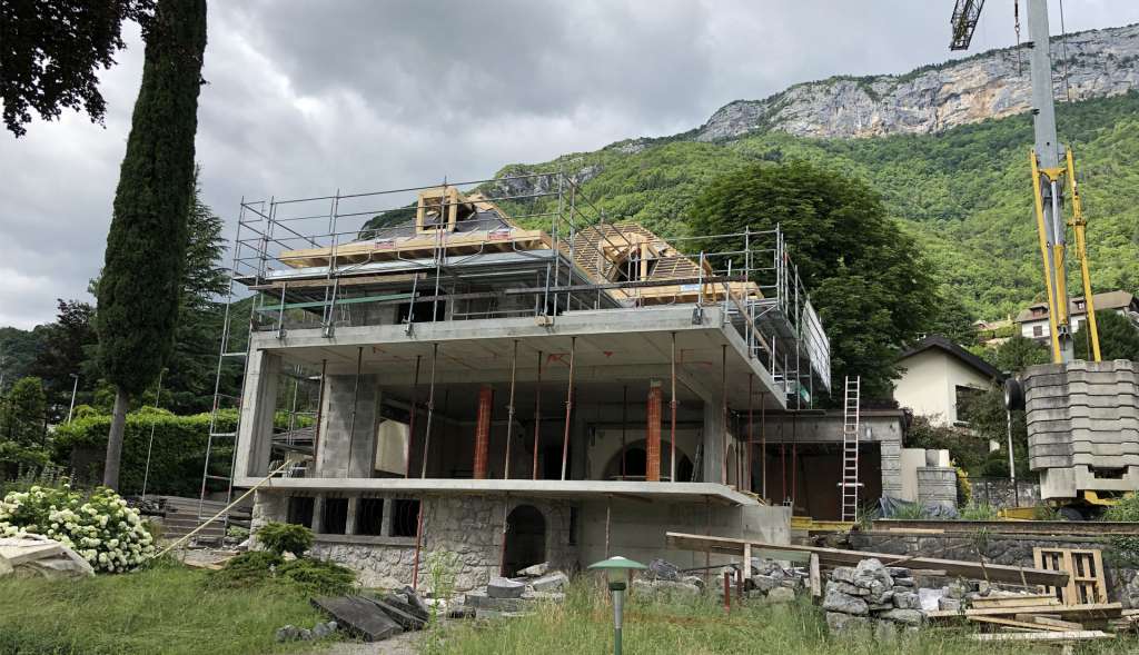 2 ans de travaux ont été nécessaires pour revoir l’intégralité de la villa : dalles, toiture, fenêtres, électricité, plomberie, chauffage… Une extension de 30m² a également été créée afin d’augmenter la surface salon et terrasse face au lac.